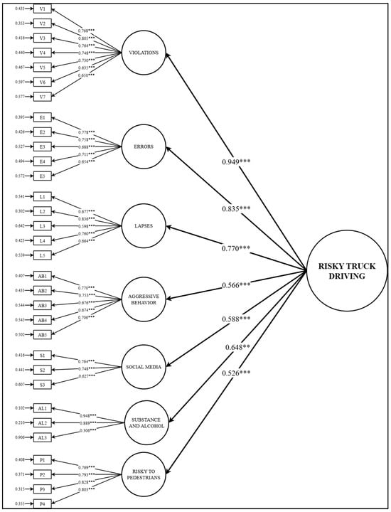The results of the modification indices further highlighted the complexity of risky driving behaviors among truck drivers, showing that some behaviors, although belonging to different dimensions, were significantly correlated. For example, honking out of annoyance (AB1) was associated with speeding through yellow lights (V2), reflecting impatience and time pressure in truck driving. Mobile phone use while driving (S1, S2) was correlated with failures in traffic observation (E2) and wrong-route driving (L6), indicating the direct impact of distraction on driver attention. Similarly, alcohol-impaired driving (AL1) was linked with neglecting yield signs (E5), pointing to impaired decision-making under intoxication. These associations confirm that risky driving behaviors among truck drivers do not occur in isolation but overlap and interact under real working conditions. Allowing residual covariances only for theoretically justified pairs not only improved the model fit but also provided a more realistic representation of on-road behaviors in this occupational group.