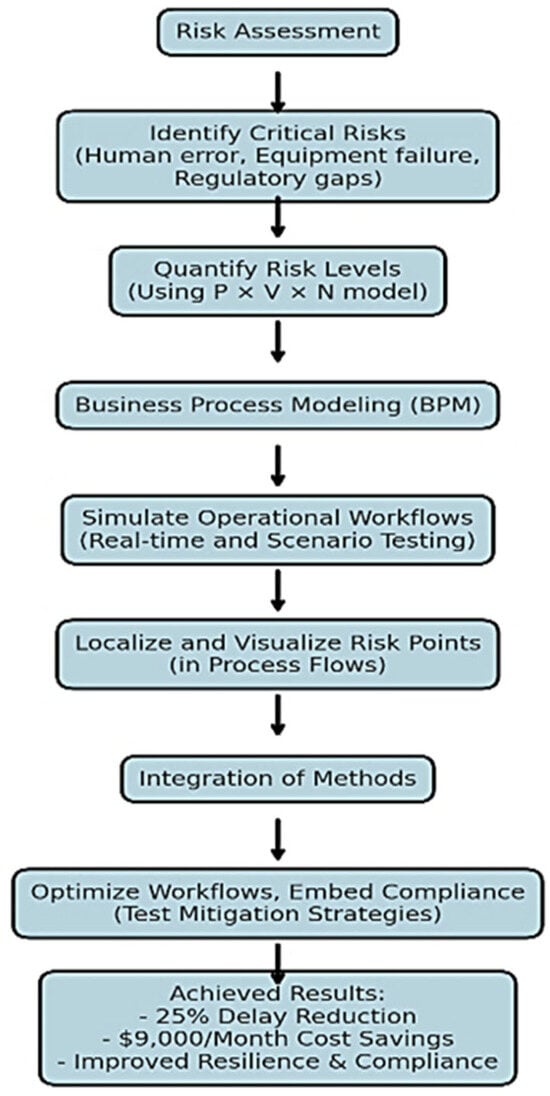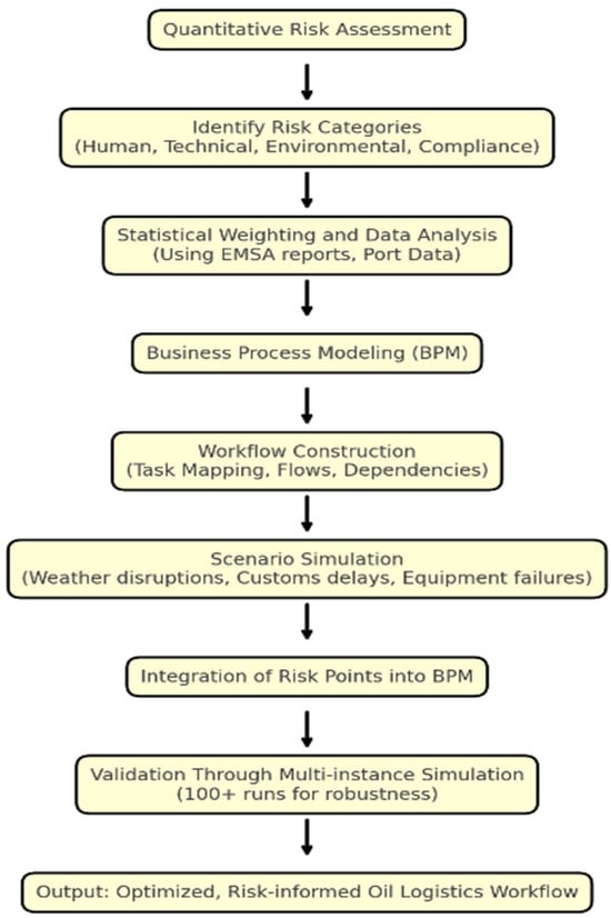 Adding to the methodology established and detailed in Figure 1’s workflow, Figure 8 illustrates the integrated methodological framework applied in this study, connecting probabilistic risk assessment with dynamic business process modeling (BPM) for petroleum logistics operations. The framework begins with a risk assessment phase, where systemic vulnerabilities are identified through structured analysis. This stage includes the identification of critical risk factors such as human error, equipment malfunction, and regulatory non-compliance, consistent with maritime risk research []. These risks are not considered in isolation; rather, they are quantitatively assessed using a probabilistic framework (P × V × N), ensuring the data-driven prioritization of operational threats [].
