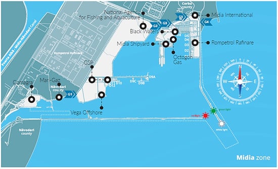 Regarding the logistics of oil product operations, multimodal systems optimize fuel transfer from offshore terminals to inland distribution points, mitigating single-mode dependency and enhancing risk resilience. In the case of the Port of Midia in the Romanian Black Sea region, selected as a case study in the present research, the integration of sea, pipeline, rail, and road transport systems represents a critical structure for national fuel supply. Similar port logistics models are documented in ports such as Rotterdam and Antwerp, where sophisticated intermodal operations are core to petrochemical distribution [], with modern oil terminals integrating sensor-driven loading arms, automated hose systems, and real-time monitoring [].