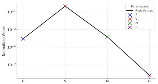 The risk assessment framework is structured around the probabilistic estimation of key operational vulnerabilities, based on three core parameters: the probability of incident occurrence (P), the vulnerability of port infrastructure (V), and the exposure of goods and assets to potential hazards (N). These parameters are integrated into a composite risk score using the following formulation: R = P × V × N; here, each parameter is derived from empirical port data, historical accident reports, and expert evaluations, normalized against established benchmarks [,]. The variables considered include human factors (e.g., crew negligence, decision-making failures), technical risks (e.g., equipment malfunctions, poor maintenance), environmental risks (e.g., adverse weather conditions), and compliance risks (e.g., regulatory violations). Weighted statistical techniques are employed to prioritize these risks based on their historical frequency and operational impact. The probabilistic model enables the identification of high-risk operational segments within the multimodal logistics flow, thereby informing targeted mitigation strategies.