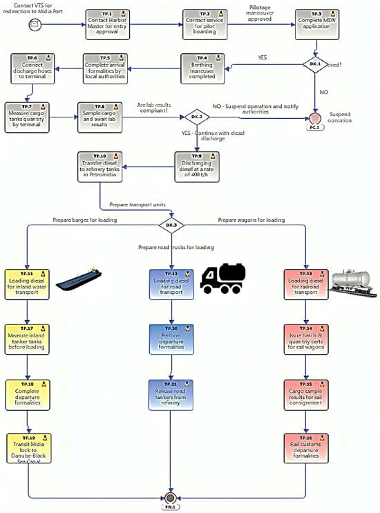 - Optimization of multimodal logistics flows—this objective focuses on identifying and analyzing the critical operational factors that influence time efficiency and coordination across maritime, rail, road, and inland waterway transport. Then, using the AuraPortal BPM Modeler vs. 1.7.32 platform, the study simulates real-world scenarios, including adverse weather, technical incidents, or documentation delays, to optimize the oil unloading/discharging and distribution workflows [].