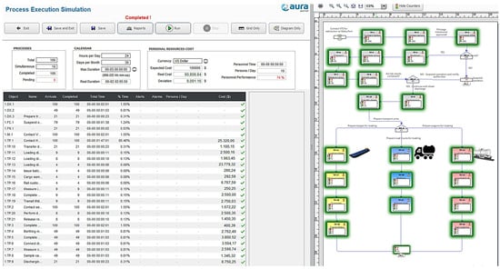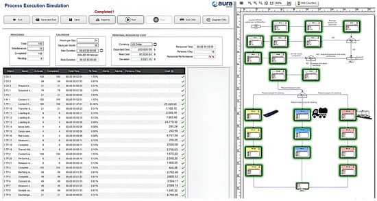 Following risk quantification, the methodology transitions into the Business Process Modeling (BPM) phase. Here, the workflows of oil product logistics are dynamically simulated using tools like AuraPortal BPM Modeler. This simulation enables the visualization of real-time operations, highlighting where and how identified risks materialize within the operational chain []. For example, while risk models may statistically prioritize customs delays, the BPM simulation reveals their exact operational bottleneck location (TP.16) and quantifies their impact on the total duration and cost of the process.