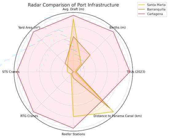 Radar chart comparing key infrastructure attributes of Santa Marta, Barranquilla, and Cartagena ports in Colombia and the TEUs resulting from port handling operations.