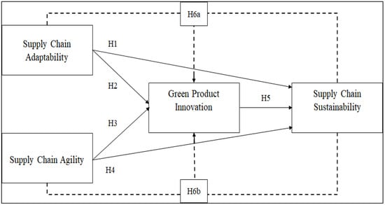 Within the framework of DCT, firms achieve sustainable competitive advantage by transforming and reconfiguring operational capabilities to meet environmental and market demands []. While adaptability and agility serve as foundational dynamic capabilities, their direct impact on sustainability may be limited unless they are channeled through innovation-focused mechanisms [,]. GPI functions as one such mechanism that enables firms to convert the flexibility and responsiveness gained through adaptability and agility into eco-efficient, sustainable outputs [,]. For example, adaptability may provide the structural flexibility necessary to adopt new green technologies, but GPI translates that potential into actual product innovations that reduce environmental harm. Similarly, agility may enable firms to respond quickly to regulatory or consumer-driven sustainability demands, but GPI allows them to do so through innovative, environmentally conscious product solutions [,]. This mediating role reflects GPI’s position as a capability deployment tool, linking supply chain dynamics to sustainable performance. Accordingly, it proposes that GPI mediates the relationship between supply chain adaptability and supply chain sustainability, while positing that GPI mediates the relationship between supply chain agility and supply chain sustainability.