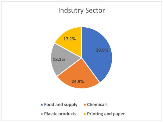 A non-probability (judgmental) sampling method was utilized to select participants. This strategy, as articulated by Malhotra [], enables researchers to intentionally select participants based on their expertise, experience, and pertinence to the study objectives. A probability sampling approach was deemed unfeasible for this study due to the absence of a comprehensive and publicly accessible database of supply chain professionals across Jordanian manufacturing firms, as well as practical constraints related to time, cost, and access limitations in the field. Instead, we employed judgmental (expert) sampling, a common approach in organizational and supply chain research when targeting informants with specific domain knowledge [,]. Respondents were selected based on their managerial roles in logistics, procurement, operations, or sustainability functions, ensuring that participants possessed the knowledge required to provide informed responses related to supply chain adaptability, agility, and green innovation. The firms represented spanned key sectors including food, chemicals, plastics, and printing accounting for the majority of Jordan’s industrial activity. This sampling strategy enhances the reliability of the findings while reflecting the study’s practical research context [,].