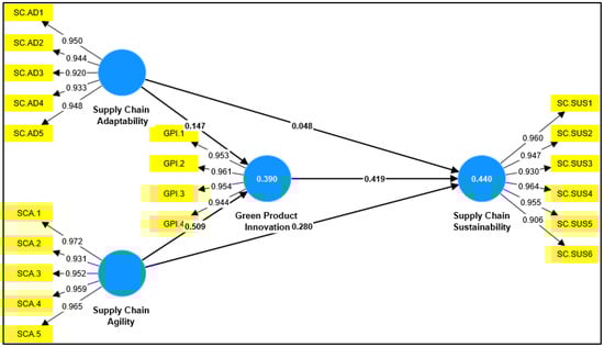 To assess the mediating role of green product innovation (GPI) in the relationships between supply chain adaptability, agility, and sustainability, we used the bootstrapping method with 5000 resamples and reported bias-corrected 95% confidence intervals for the indirect effects. This approach is widely recommended for mediation testing in PLS-SEM, as it does not rely on the assumption of normality. The results indicated that the indirect effects were significant for both H6a and H6b, confirming GPI as a mediating variable. Additionally, we have provided a structural model path diagram displaying the standardized path coefficients (β-values), which visually summarizes the strength and direction of relationships among all latent variables.