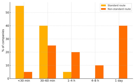 One operational area where this asymmetry is evident is the preparation of transport quotations. For standardized routes, the process was efficient: over 50% of surveyed enterprises could generate an official quote within 30 min, and another 40% within one hour. This suggests the use of templates, predefined pricing structures, or automated support.
