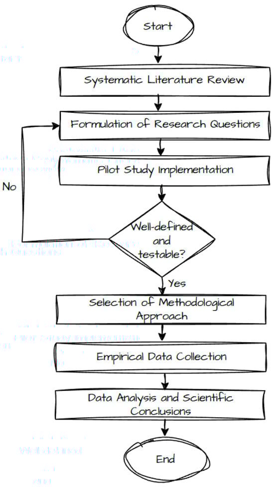Figure 1 illustrates the sequential structure of the research process through a flowchart, beginning with a systematic literature review and the formulation of research questions. A pilot study is then conducted to refine the design, followed by a decision stage assessing whether the research questions are well-defined and testable. If not, the process loops back to earlier stages to ensure clarity and validity. Once the questions are properly established, the methodological approach is selected, leading to empirical data collection and, subsequently, data analysis and the formulation of scientific conclusions. The diagram emphasizes the iterative nature of research design, ensuring methodological rigor, reliability, and the alignment of outcomes with the stated objectives.