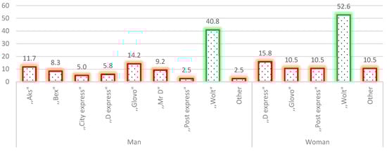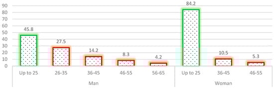 The Independent Samples T-Test was used to examine the differences in the respondents’ attitudes, depending on the gender of the respondents. The Independent Samples T-Test shows that there are statistically significant differences between courier services drivers and gender of respondents (F = −3.174; p = 0.003), as well as between the age and gender of the respondents (F = 2.197; p = 0.030). The percentage of respondents by gender and courier services drivers in which the respondents are employed is shown in Figure 2, while the percentage of respondents according to gender and age is shown in Figure 3.