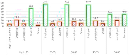 The highest percentage of respondents under the age of 25 who work as courier service drivers by profession are students, as much as 60.6%. Respondents aged 26 to 55 in the largest percentage of cases are employed who do delivery as a basic or part-time (additional) job, while respondents aged 56 to 65 are mostly pensioners (40% respondents) and employed (40% of respondents) (Figure 4).