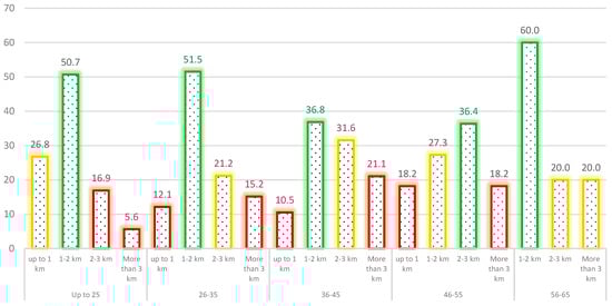 The minimum distance covered by respondents during one delivery, for all age categories except for the category of 46 to 55 years old, in the largest percentage, is from 1 to 2 km. For the age category of 46 to 55 years, in the largest percentage (36.4%), the minimum distance covered by respondents for one delivery is 2 to 3 km (Figure 5).