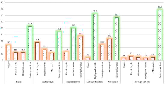 Respondents who use bicycles, e-bikes and motorcycles for the delivery of goods in the largest percentage of cases would choose passenger cars as the preferred transport vehicle for the delivery of goods, viewed from the aspect of road safety, while drivers of electric scooters would in 50% of cases, as well as drivers of light goods vehicles in 72% of cases stayed with their original choice. Drivers who use passenger cars to deliver goods in 78.5% of cases would remain faithful to their choice, viewed from the aspect of road safety (Figure 7).