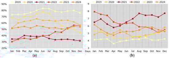Derived from the Global Liner Performance (GLP) report, with schedule reliability figures up to and including December 2024 [], Figure 1a illustrates the trend in liner service schedule reliability, expressed as a percentage over the period from 2019 to 2024. The highest reliability was recorded in 2019, after which it began to decline sharply in mid-2020 as a result of the COVID-19 pandemic. The lowest reliability was observed in 2021, falling below 40%. For most of 2023, reliability remained above 60%, but in 2024 it dropped again to a level of 50–55%. This decline was driven by geopolitical factors, particularly the conflict in the Red Sea, which led to the suspension of liner service transits through the Red Sea and Suez Canal, ultimately affecting global schedule adherence.