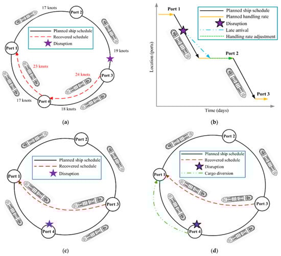When a certain vessel in liner service is significantly delayed or is unable to complete its rotation due to more disruptions, a substitute vessel can be deployed to take over []. Such a decision requires that the carrier have an available vessel that can be put into service at the loading ports. With such a decision, which is very expensive for the carrier, delays will be reduced and a certain level of liner service will be maintained. In this way, the carrier provides the possibility of loading cargo for the shippers at the intervals provided for in its pro forma sailing schedule.