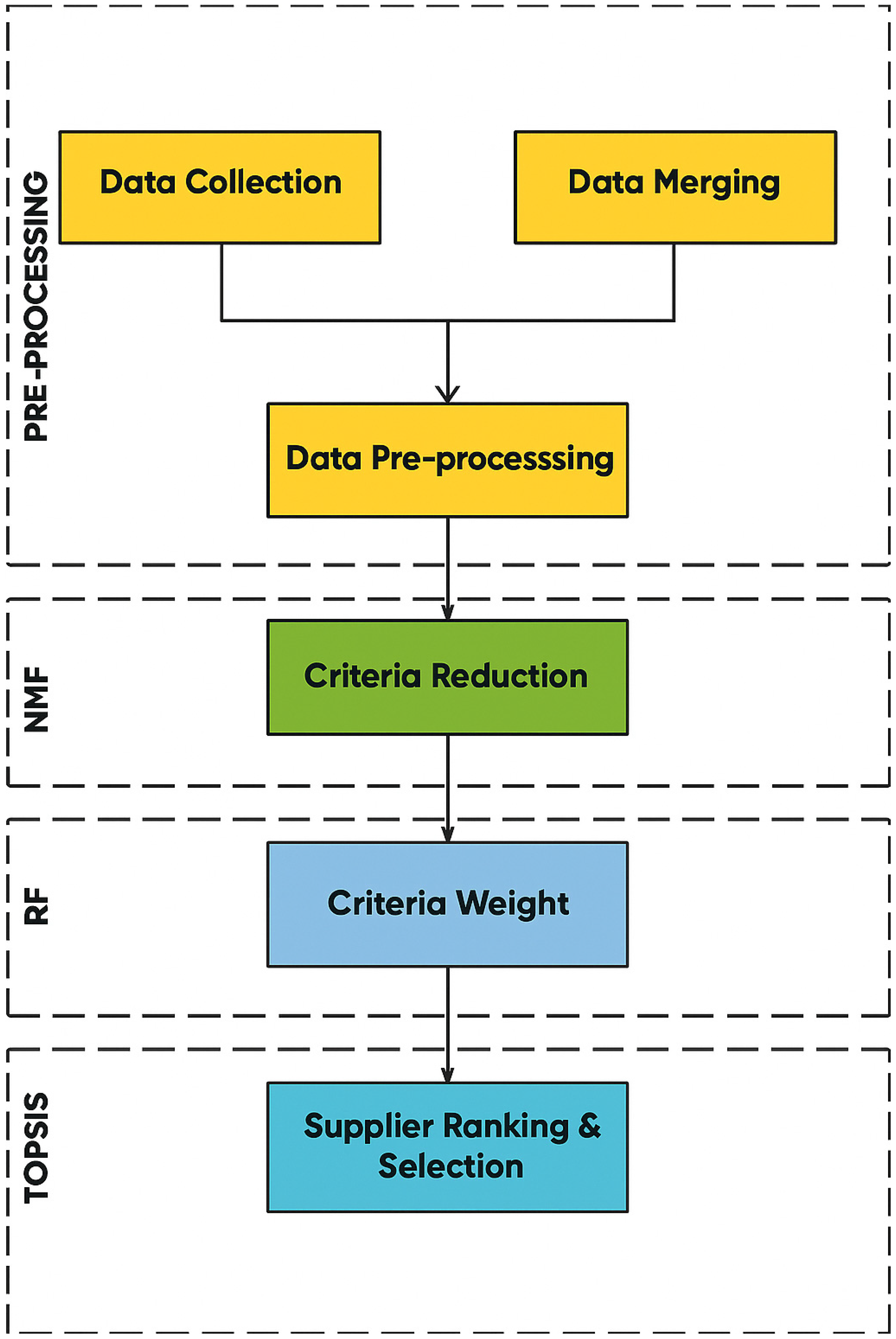 It bridges the gap between traditional supplier selection approaches and intelligent decision support systems, integrating machine learning to automate weight generation and dimension reduction through RF and NMF, respectively.