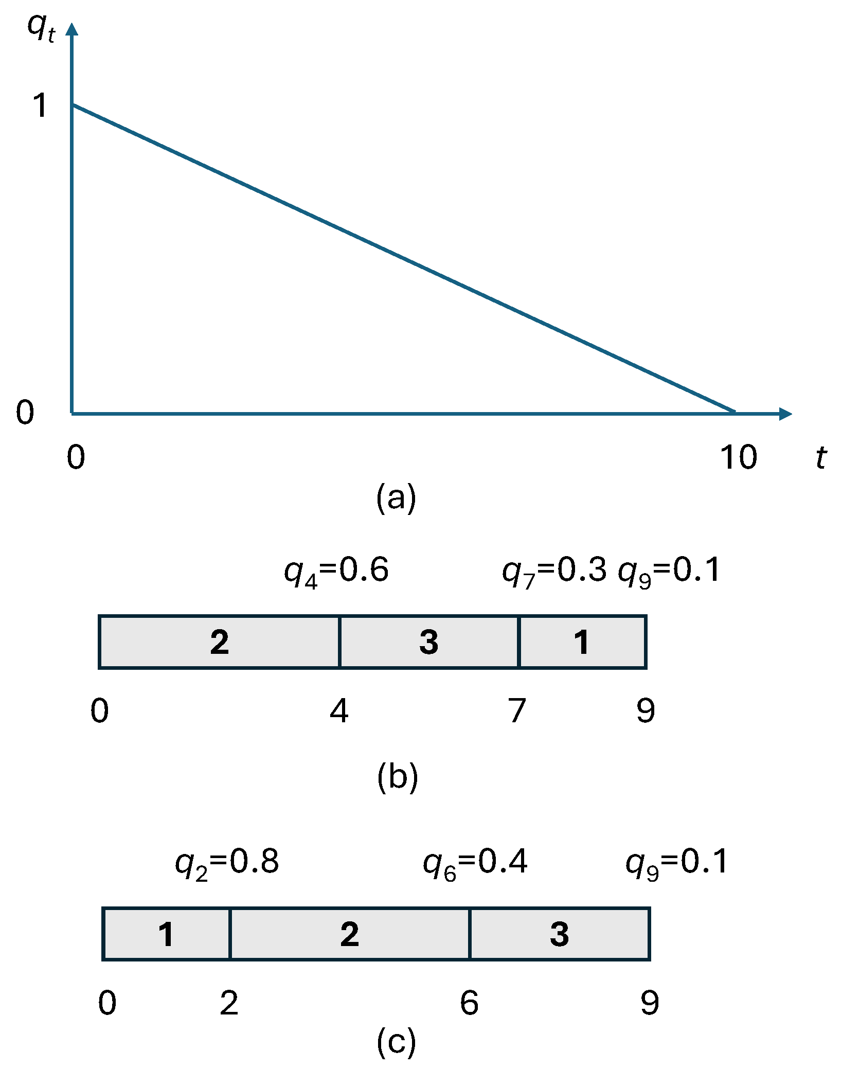 Example 1. Consider the example in Table 1, where . Figure 1a shows the probability that the machine is still working at time t. Starting from 1, linearly decreases, becoming 0 at time . Figure 1b illustrates a feasible schedule . Under this schedule, the probability of successfully carrying out job 2 is ; hence, the expected reward from scheduling job 2 is . The probability of successfully carrying out job 3 is , and therefore, job 3 contributes by . A similar computation for job 1 yields ; hence, the total expected reward of this schedule is . We next show that UIMSP(1) can be efficiently solved when