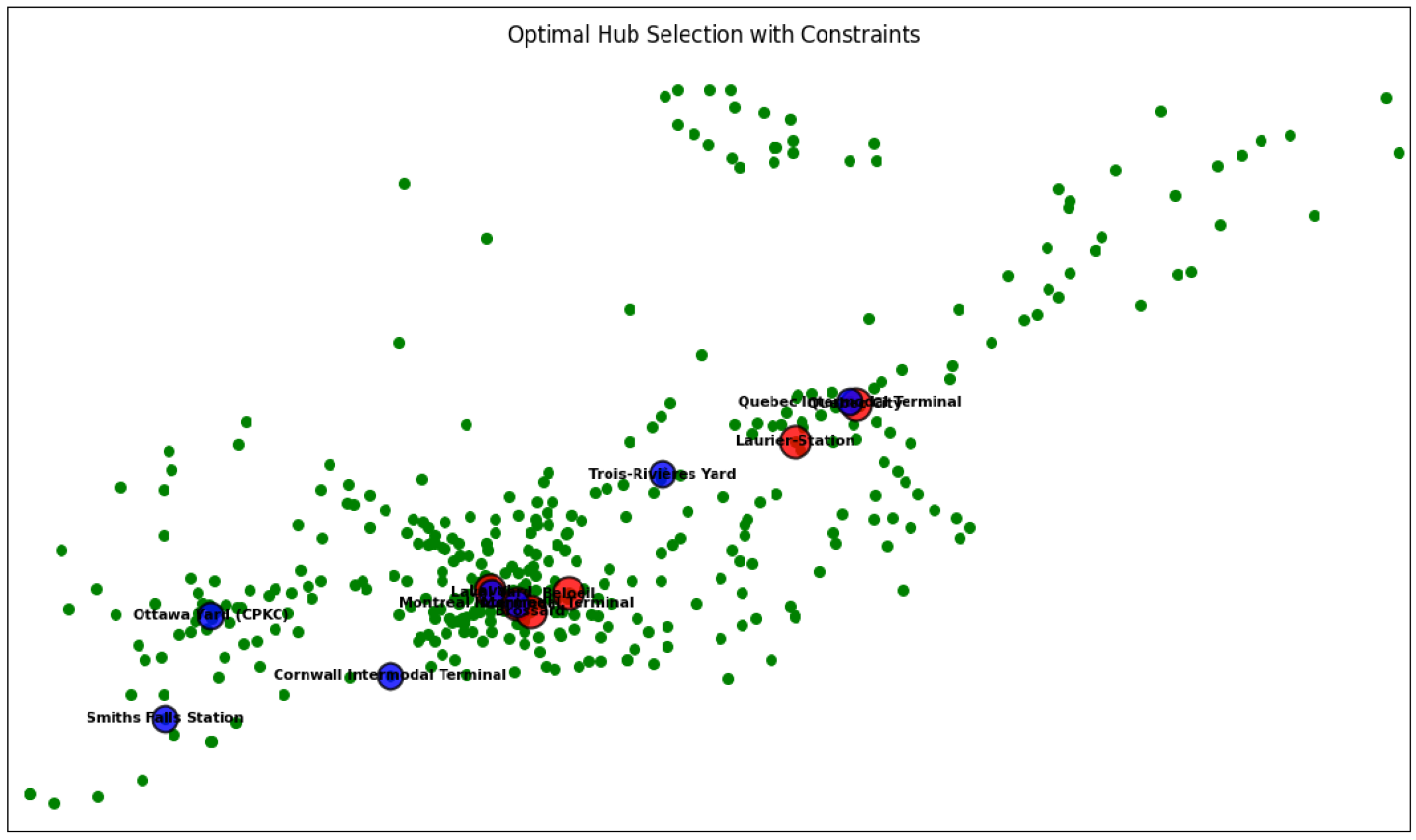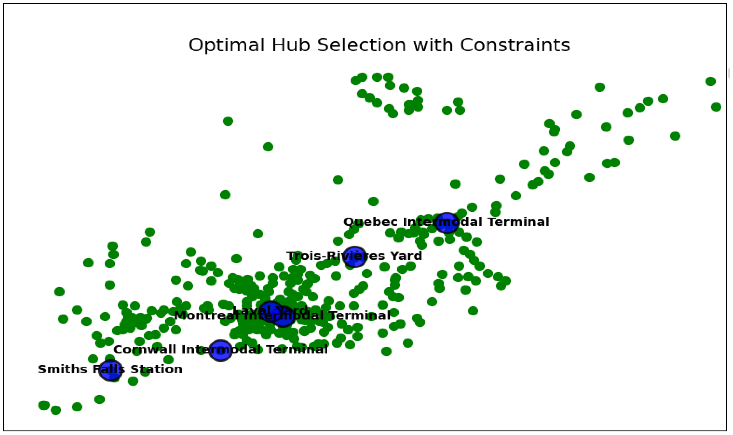 - The key problem includes identifying optimal geographic sites for primary and secondary hubs to maximize coverage and minimize infrastructure costs. Key constraints include geographic: avoidance of protected areas (e.g., Gatineau Park), mountainous terrain (e.g., Laurentians), and heritage zones (e.g., Rideau Canal); multi-modal integration: co-location with existing freight terminals (e.g., Montreal Port) and passenger stations (e.g., Ottawa Central); and policy issues: compliance with federal/provincial land use regulations and Indigenous land rights (e.g., Wendake Nation territories), etc.
