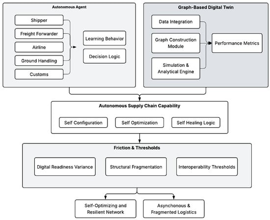 Each framework carries inherent limitations: the ASC overlooks governance and institutional control mechanisms, the GBDT requires high data intensity and computational resources, and the interoperability-threshold approach assumes relative temporal stability. Recognizing these limitations justifies their combination, as each framework compensates for the conceptual blind spots of the others. As depicted in Figure 1, the conceptual model illustrates this dynamic relationship. The upper layers represent autonomous decision-making among shippers, freight forwarders, airlines, ground handlers, and customs agents, while the structural layer visualizes information flows and digital interconnections through the GBDT. The lower level captures digital-readiness variance, structural fragmentation, and interoperability thresholds as frictional forces that determine whether the network evolves toward a self-optimizing and resilient configuration or remains in a fragmented, asynchronous state [,].
