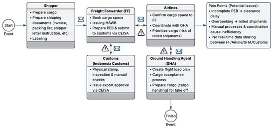 Figure 2 presents the existing air cargo export process in Indonesia, derived from process mapping of the CGK corridor. The model depicts interactions among shippers, freight forwarders, airlines, ground-handling agents, and customs authorities, highlighting inter-organizational dependencies and bottlenecks such as redundant documentation, manual verification, and asynchronous communication. Quantitative analysis showed an average of 4.2 redundant document submissions, a 12.22 h average communication delay, clearance-time variability between 24 and 72 h, and average capacity utilization of 55.08% with peaks up to 85%. These empirically observed frictions were encoded as constrained parameters within the simulation, forming the baseline of Scenario 1 (Baseline) and influencing document-processing algorithms across all subsequent scenarios.