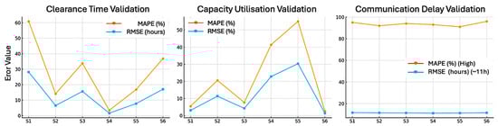 Validation results for clearance time, capacity utilization, and communication delay across six simulation scenarios (S1–S6). The Mean Absolute Percentage Error (MAPE) and Root Mean Square Error (RMSE) indicate the model’s quantitative alignment with empirical benchmarks, showing the lowest error values in Scenario 4 (Stakeholder Collaboration Only).