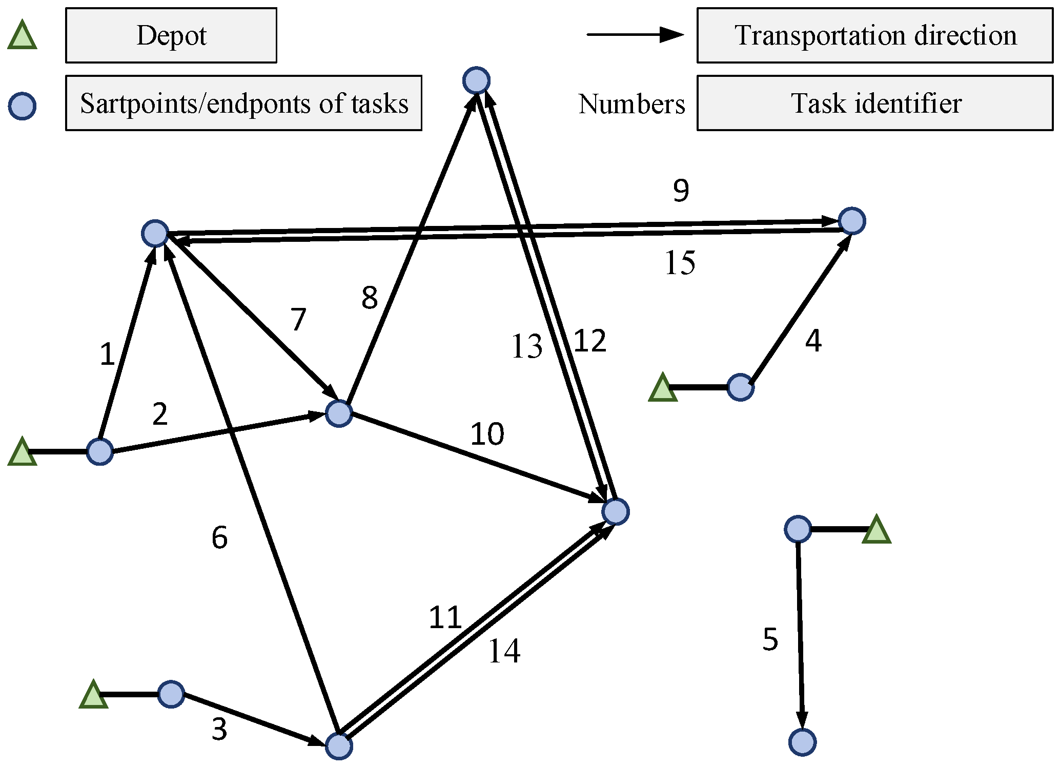 Figure 1, every directed line segment represents a specific transportation task, where the endpoints correspond to the pickup and delivery locations, and the associated number indicates the task identifier. During model formulation, each segment is treated as a loaded node. Only the origin and destination of each node are considered functionally relevant, while the actual transit path is disregarded. Additionally, a virtual task point is introduced adjacent to each depot to facilitate decoupling between depot and task node within the model, under the assumption that the physical distance between them is negligible.