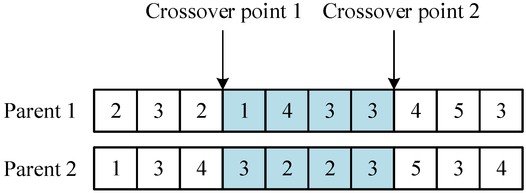 (1) Two chromosomes are selected from the population as parent 1 and parent 2 for crossover operation. Based on the chromosome string length, two unequal crossover points are randomly generated on each chromosome, dividing the two parent chromosomes into three parts. The specific operation is shown in