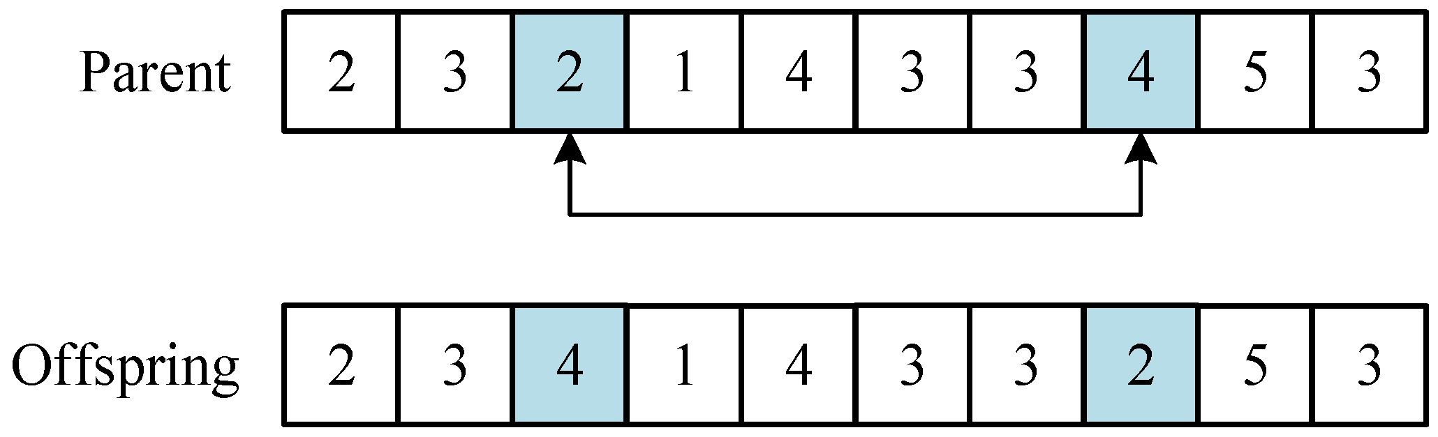 Figure 6, where the arrows are the positions of swap mutation points and the blue part is the genes that performs swap mutation.