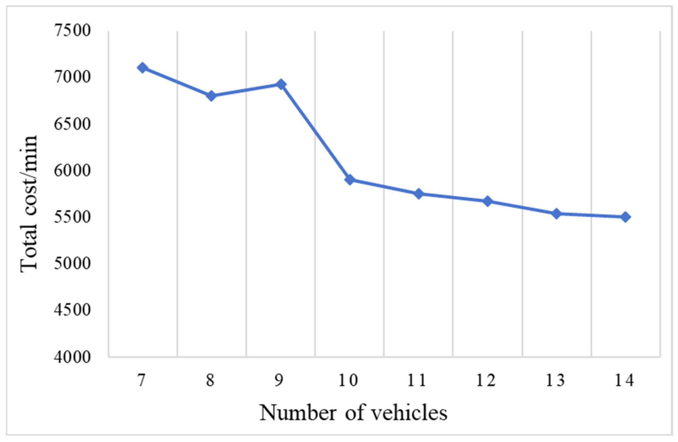 Figure 8 shows the change in the total cost when the number of available vehicles is increased. Obviously, the total cost shows a decreasing trend with the increase in the number of vehicles used, and the total cost is significantly reduced when the number of vehicles is increased from 9 to 10. However, when the number of vehicles used exceeds 10, the total cost only decreases slightly. This indicates that the optimal number of vehicles used is 10 in the current actual task situation.