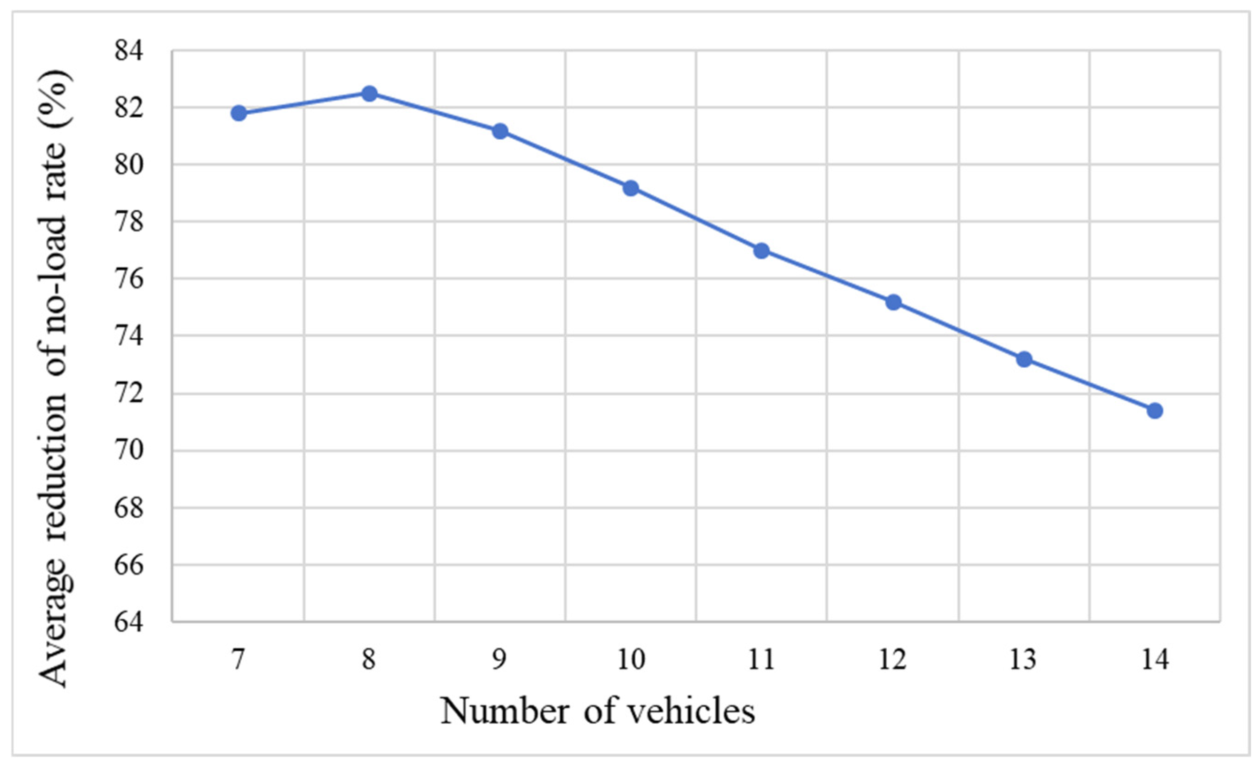 Figure 9 shows the change in the average reduction in no-load ratio for different numbers of vehicles used. As the number of vehicles used increases, the average reduction empty rate gradually decreases. This is because with the same number of tasks assigned to more vehicles, each vehicle completes fewer tasks individually and returns to the parking lot earlier, therefore the average reduction rate decreases.