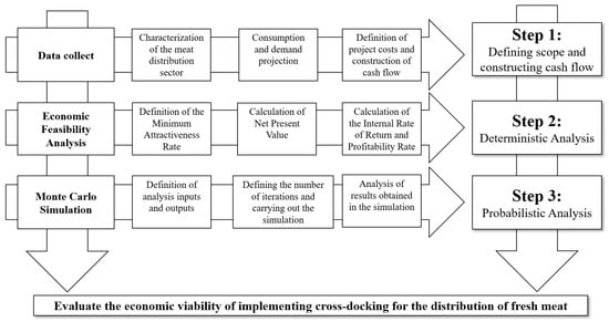 Conceptual model of the study stages. Step 1: defining scope and constructing cash flow; Step 2: deterministic analysis; and Step 3: probabilistic analysis. The steps converge to achieve the general objective of this study. Source: adapted from [26,27,34,35,36,37,38].