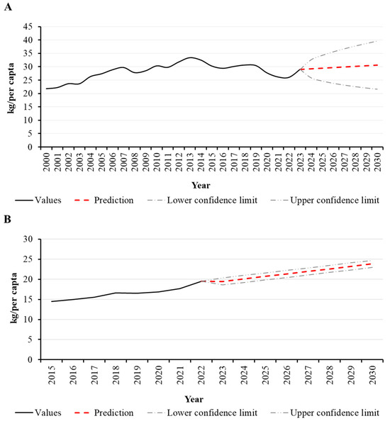 Consumption of meat over time and its prediction until 2030. (A)—Per capita beef consumption (kg/per capta.year). (B)—Per capita pork consumption (kg/per capta.year).
