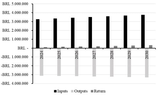 Using the annual demand values already calculated and multiplying them by the total annual unit costs, the projected cash flow outputs are obtained. On the other hand, to calculate annual inputs or revenues, a unit value of BRL 0.66/kg was considered, which is an amount already paid by the market for the distribution of meat in the region where the project is implemented. This value was defined based on logistics contracts established between the investor and the contracting company. Therefore, analogously, when multiplying this value by the annual demands, we have the annual inflows or revenues from the projected cash flow. The projected cash flow can be viewed in Figure 5.