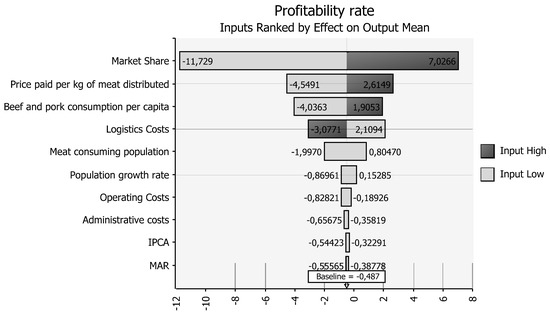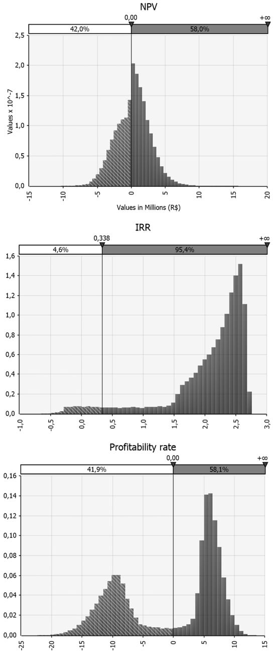 As stipulated in the methodological procedures, Step 3 of this study corresponded to the aggregation of the Monte Carlo Simulation with the results of the Economic Feasibility Analysis (EFA). The specific project inputs and outputs were defined for this stage. The inputs represent variables that have a degree of uncertainty when considering traditional EFA. Thus, the inputs chosen were the following variables: market share (%); operating costs (BRL); logistics costs (BRL); administrative expenses (BRL); price paid per kg of meat distributed (BRL/kg); MAR (%); population growth rate (%); IPCA (%); consumption of beef and pork per capita (kg/inhabitant/year), and percentage of the meat-consuming population (%). The outputs represent the variables resulting from the analyses of the simulation carried out; the outputs were NPV, IRR, and profitability rate.