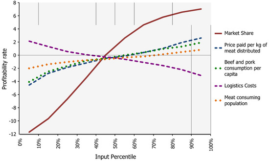 According to the analysis in Figure 7, the greatest impacts on profitability are observed with the inputs: market share, price, per capita consumption, logistics costs, and percentage of the meat-consuming population. The tornado diagram presented illustrates the sensitivity of the profitability rate to variations in key input variables used in the Monte Carlo Simulation. The variables are ranked according to their impact on the mean profitability rate, measured as the difference between high and low input values. The most influential factor is Market Share, which exhibits the greatest range of effect (from −11.729 to +7.0266), indicating that small variations in projected market penetration significantly alter profitability outcomes. This is followed by the price paid per kilogram of meat distributed and beef and pork consumption per capita, both of which show strong positive correlations with profitability when values are high. In contrast, logistics costs and operating costs negatively impact profitability, although to a lesser extent than demand-side variables. Inputs such as Population Growth Rate, administrative costs, and MAR (Minimum Attractive Rate of Return) show moderate to low sensitivity, suggesting limited influence within the simulated range. The chart underscores that demand-side variables (market share, consumption, and price) are the primary drivers of profitability, while cost-side variables, particularly logistics, remain key constraints. This sensitivity analysis supports strategic prioritization by identifying which variables should be targeted in risk mitigation and project planning efforts. Another important analysis corresponds to the correlation between these project inputs and profitability. Figure 8 presents a sensitivity curve illustrating the relationship between selected input percentiles and the resulting profitability rate. A strong positive correlation is observed between market share and profitability, characterized by a steep, upward-sloping curve. This suggests a near-linear relationship within the simulated range, indicating that incremental gains in market share generate proportional increases in profitability.