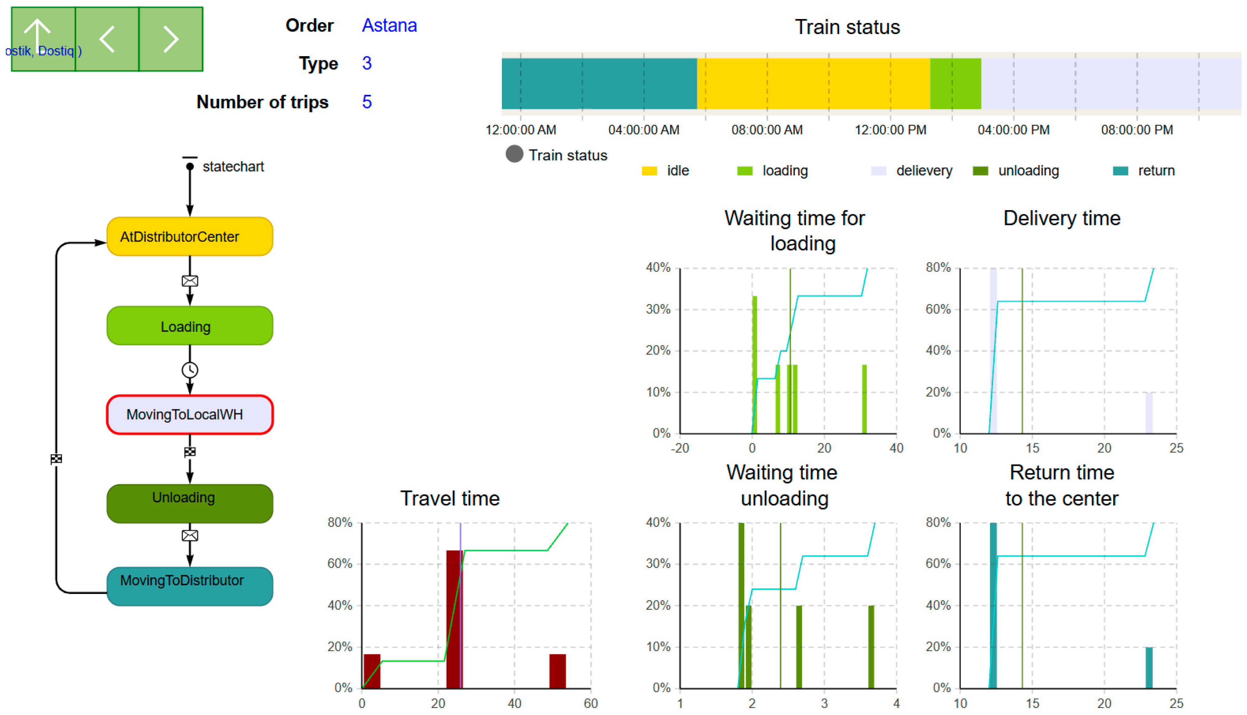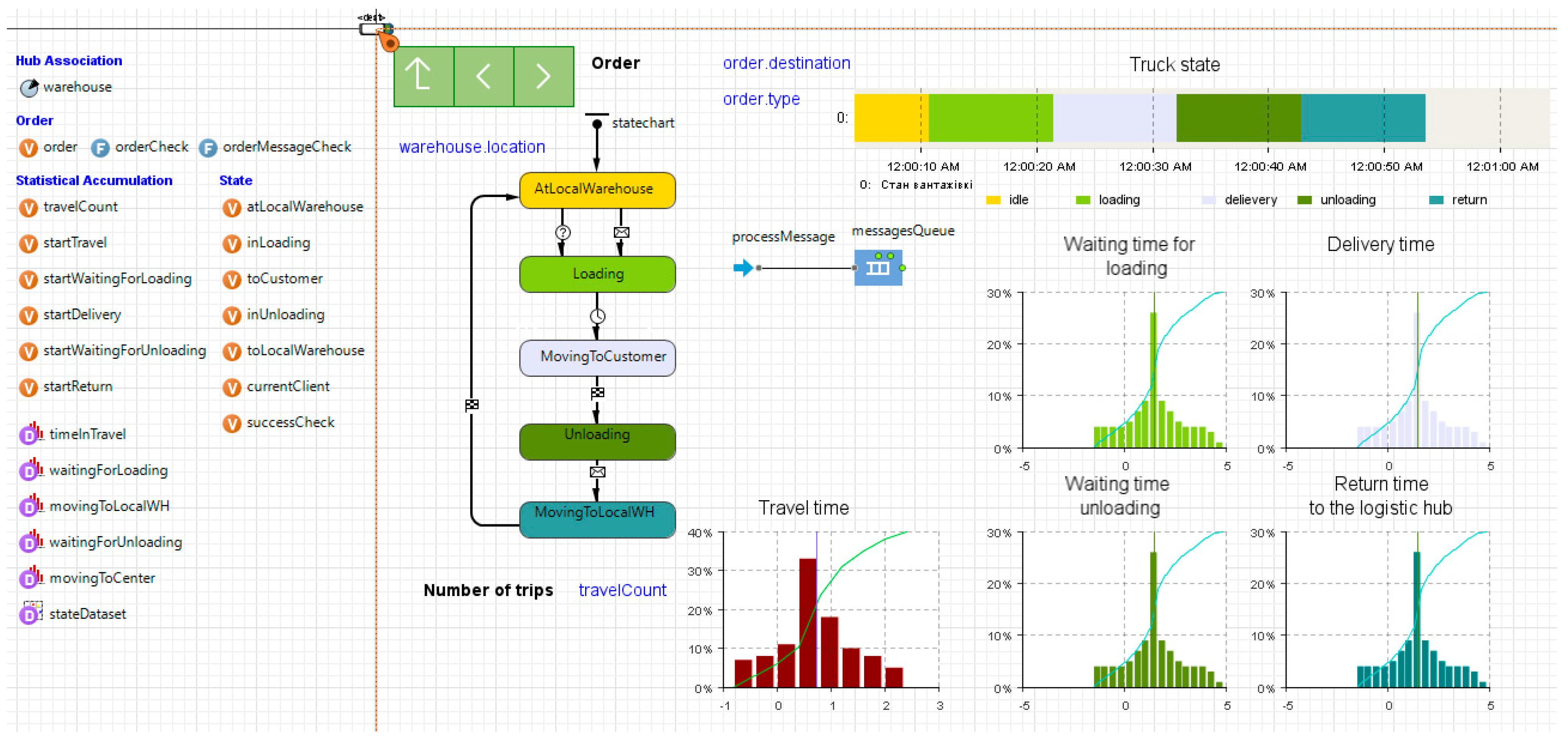 Figure 3) is structured through a statechart diagram that captures the full life cycle of a truck, including stages such as waiting at the warehouse, loading cargo, traveling to the customer, unloading, and returning to the logistics hub. Transitions between these states are governed by specific event triggers, and relevant performance metrics are recorded at each stage. The agent includes key embedded parameters and variables, such as the current warehouse location, the destination associated with a particular order, the number of completed trips, and the status of the message queue that manages delivery requests. To evaluate operational efficiency, the Truck agent collects statistical data including waiting times for loading and unloading, delivery and return durations, and overall travel time. These performance indicators are visualized in real time through integrated histograms, enabling dynamic monitoring of model performance. Geographical routing is implemented using OpenStreetMap-based road networks, ensuring that trucks follow realistic paths between locations. The Truck agent is also linked to a specific logistics hub, which allows aggregation of fleet utilization statistics at the hub level. This setup enables the model to reflect both individual vehicle behavior and system-wide logistics dynamics in a spatially accurate and analytically rich manner.