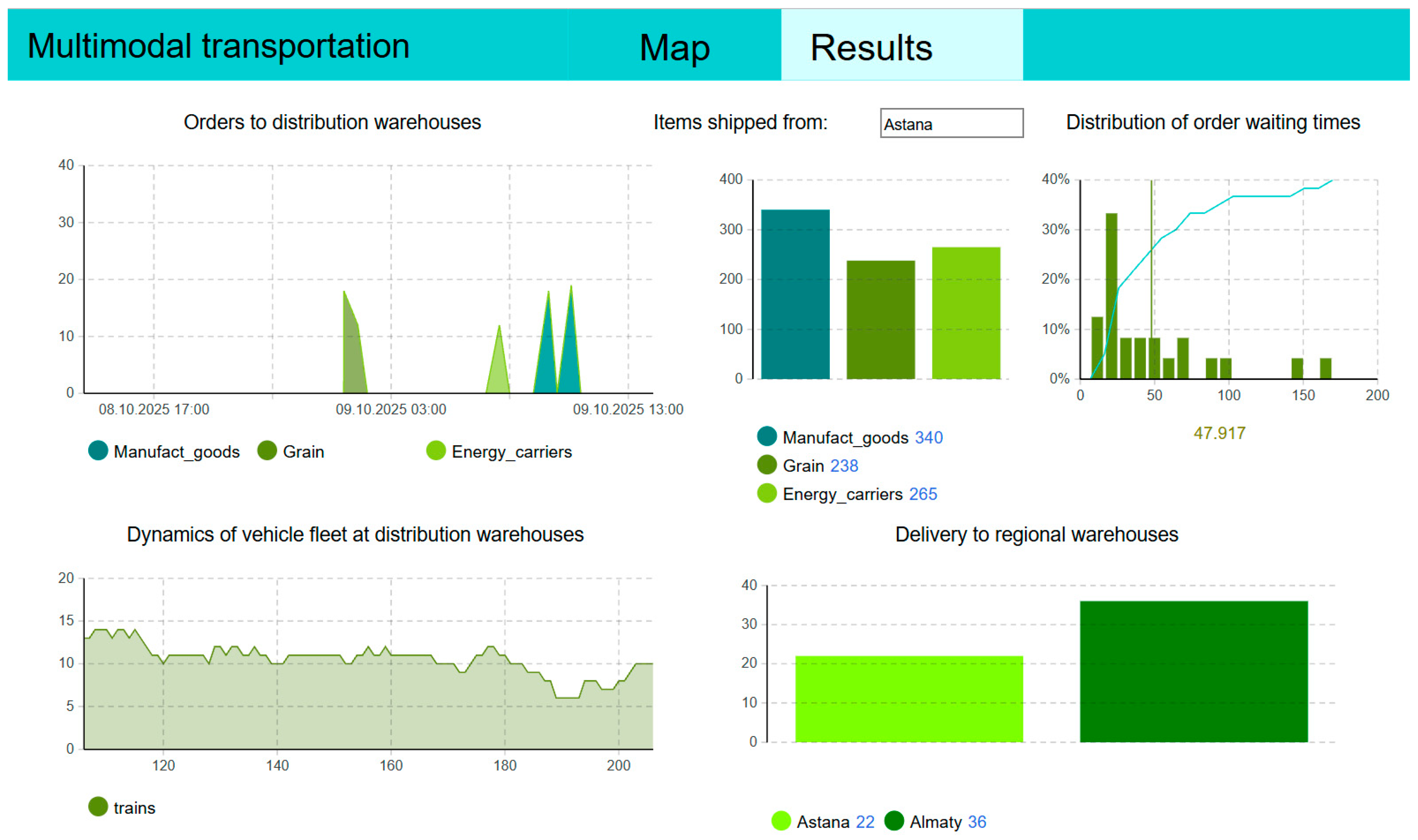 Thus, agent-based simulation with geographic routing and consideration of multimodal cargo characteristics represents an effective approach for strategic analysis, confirming its relevance and applied value among contemporary studies. The obtained results can be used to evaluate modernization scenarios, identify bottlenecks, and plan investments in Kazakhstan’s transport infrastructure in the context of digital transformation.