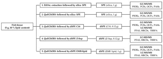 The comparison of the tested methods is summarized and critically evaluated in the following paragraphs. In total, five different methods often used for the determination of POPs and PAHs in fatty matrices, such as fish, were compared: (1) EtOAc extraction followed by silica SPE clean-up; (2) QuEChERS extraction followed by silica SPE clean-up; (3) QuEChERS extraction followed by dSPE C18 clean-up; (4) QuEChERS extraction followed by dSPE Z-Sep clean-up; and (5) QuEChERS extraction followed by dSPE EMR-lipid clean-up.