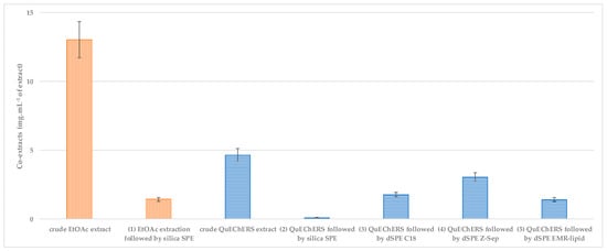 As shown in Figure 2, the crude EtOAc extract contained almost three times more co-extracts than the crude QuEChERS extract. The purification efficiency was determined as the reduction in co-extracts content after purification of the respective crude extracts using SPE or dSPE (crude EtOAc and QuEChERS extract = 100%).
