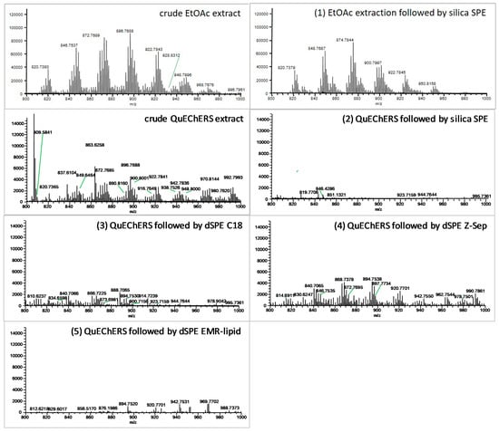 The comparison of TAG removal (scanned mass range m/z 800–1000) between the crude and purified extracts of the smoked trout using different sorbents detected by DART-HRMS.