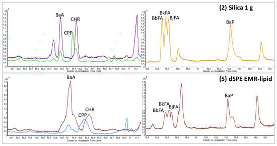 - Urban, M.; Lesueur, C. Comparing d-SPE Sorbents of the QuEChERS Extraction Method and EMR-Lipid for the Determination of Polycyclic Aromatic Hydrocarbons (PAH4) in Food of Animal and Plant Origin. Food Anal. Methods 2017, 10, 2111–2124. [Google Scholar] [CrossRef]