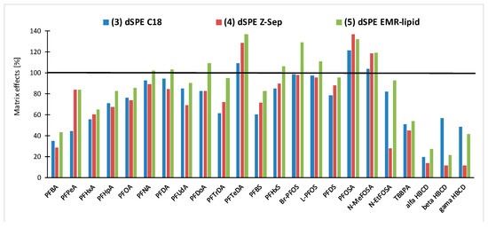 It must be noted that the results achieved for PFAS, TBBPA, and HBCDs using dSPE clean-up were not compared with those obtained by silica clean-up due to a higher affinity of these analytes to the stationary phase (silica and Florisil), resulting in low recoveries [,].