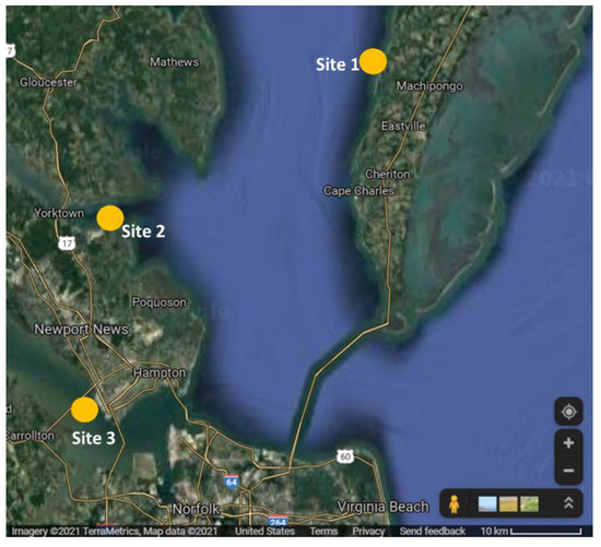 Sampling sites in the Chesapeake Bay in Virginia. Site 1: Eastern Shore; Site 2: York River; Site 3: James River.
