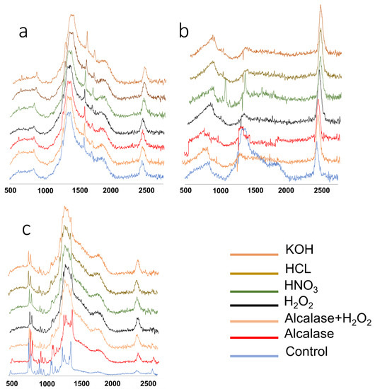 The results of the Raman spectra analysis of untreated and chemically treated plastic materials illustrate that the chemicals caused changes in the spectrum peaks (Figure 2). These changes in peak intensity and band shifting might be due to polymer molecular alteration because of the chemical digestion [35]. Peak intensities around 810, 844, 976, 1152, 1171, 1131, 1438, and 1460 cm−1 were reduced significantly after chemical treatments in PP. Thiele et al. [33] found that the PP Raman spectrum peak intensity was significantly reduced after chemical treatments. The peak intensity around 1460 cm−1, which is assigned to asymmetric bending of the CH3 group, was significantly reduced after exposing PP to the chemicals, particularly HNO3. Karami et al. [27] also found that the Raman peak intensities were reduced for PP treated with HNO3. For PET, the chemical treatments reduced the peak intensity for the ring C = C stretching at 1610 cm−1 and C = O stretching band around 1722 cm−1, which is in agreement with other studies [27,42,43]. This reduction might be related to the depolymerization of the polymer structure compared to the control group [44]. For PS, the peak intensity around 1004 cm−1, which is related to the ring breathing mode, was increased after exposure to the chemicals, which might be due to the degradation of the polymer structure and rearrangement and aggregation of the polymer chains [27]. In addition, in PS treated with HNO3, the peak at 1350 cm−1 was very sharp, and the intensity was higher than the control and treated samples, which is due to the CH deformation.