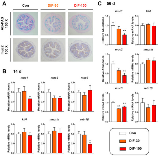 The histopathological analysis showed that the colonic mucus expression decreased after 56 days of DIF exposure (Figure 1A). AB-PAS staining showed that 30 and 100 mg/kg/d DIF exposure for 56 days decreased the colonic mucus content, especially the mixture of acidic and neutral mucins (purple color) (Figure 1A). The immunochemical staining of mucin 2 (muc2) protein showed the decrease in muc2 expression. Then, we examined the transcript levels of mucin secretion related genes in the colon of mice after the 14 and 56 days of DIF exposure. After 14 days of exposure, the mucin 1 (muc1) decreased in the DIF-100 group and muc2 decreased in the DIF-30 and DIF-100 groups though without significance (Figure 1B). When compared with the control group, the relative mRNA levels of retn1β decreased significantly in the DIF-100 group (Figure 1B). After 56 days of exposure, the muc1 and muc2 decreased significantly in the DIF-100 groups and muc3 decreased significantly in the DIF-30 and DIF-100 groups in comparison with the control group (Figure 1C).