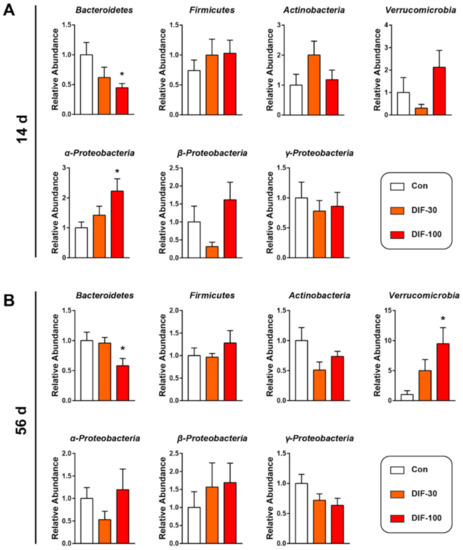 In addition to the mucus layer, the gut microbiota also play a very important role in gut health [14]. Then, we investigated the gut microbiota composition at the phylum level after DIF exposure via RT-qPCR. After 14 days of exposure, the relative abundance of Bacteroidetes decreased significantly and α-proteobacteria increased significantly when compared with the control group (Figure 2A). The relative abundance of Verrucomicrobia and β-Proteobacteria decreased in the DIF-30 group and increased in the DIF-100 group, however, no significant difference was observed (Figure 1A).