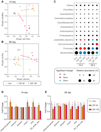 Effects of DIF exposure on the gut microbiota composition in the gut of mice. Principal coordinate analysis (PCoA) in gut microbiota after (A) 14 days and (B) 56 days of DIF exposure. (C) Relative abundance of gut microbiota at phylum level. The diversity indexes in the colonic gut microbiota after (D) 14 days and (E) 56 days of DIF exposure. * p < 0.05 versus control group.
