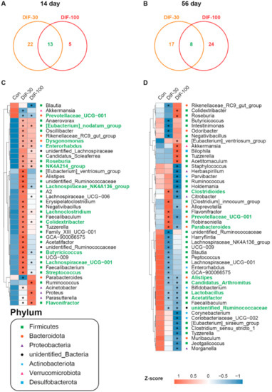 Effects of DIF exposure on the colonic gut microbiota at genus level in the gut of mice. Venn diagram of the differential genera between the DIF-30 and DIF-100 groups compared with the control group after (A) 14 days and (B) 56 days of DIF exposure. The heatmap of the differential genera after (C) 14 days and (D) 56 days of DIF exposure. * p < 0.05 versus control group.