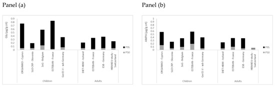 HBM4EU data showed that the exposure is widespread in the EU. In general, median concentrations below LOQ were observed in the HBM4EU studies for Gly and AMPA (Table 1 and Table 2). At the higher end of the exposure distribution, the highest concentrations (µg/L) were observed for Gly in Iceland (P95 0.37 µg/L) and for AMPA in France (P95 0.42 µg/L) (Table 1 and Table 2). When data are compared to existing data (Table 3), P95 values for Gly varied between 0.24 and 1.25 µg/L and for AMPA between 0.21 and 1.54 µg/L. The greatest P95 values for Gly (1.25 µg/L) and AMPA (1.54 µg/L) were from the study of Conrad et al. (2017) for the year 2013 (years sampled: 2001 to 2015). When a comparison is drawn with data in children [8] of the HBM4EU aligned studies, the P95 were in the same order of magnitude for children and adults but higher in children (results of combined data regardless of result QA/QC: Children: Gly 0.51 µg/g crt or 0.48 µg/L and AMPA 0.45 µg/g crt or 0.47 µg/L; Adults: Gly 0.30 µg/g crt or 0.29 µg/L and AMPA 0.30 µg/g crt or 0.33 µg/L (Table 1 and Table 2)). In Figure 1, P50 and P95 values are presented for children and adults of the different studies. For France, it was shown in the study of ESTEBAN that the P95 for Gly was equal to 0.35 µg/g crt (95%CI: 0.15 to 0.75) in adults and 0.84 µg/g crt (95% CI: 0.53 to 1.51) in children. For AMPA, this was 0.38 µg/g crt (95%CI: 0.29 to 0.44) in adults and 0.59 µg/g crt (95%CI: 0.48 to 0.76) in children. Children have a higher ingestion of food and drink per kilogram bodyweight in relation to adults. They play outdoors and are probably more exposed to pesticides in the outdoor environment. The difference in P95 between children and adults shows that care should be taken for susceptible groups like children. Although the results represent the selected studies, they give an indication of the EU exposure. HBM4EU substantially contributed to providing exposure data within the EU, nevertheless, exposure data on Gly and AMPA in children, especially those living close to agricultural fields, remain limited even though they are a vulnerable population. Limited exposure data from the US showed arithmetic mean values between 0.28 and 0.61 µg/L in children [26,27,28] with even a geometric mean value in one study of 2.5 µg/L for children of non-farming households [29]. Concentrations were higher in children than in adults of the US, however, only limited data were available [28,29].