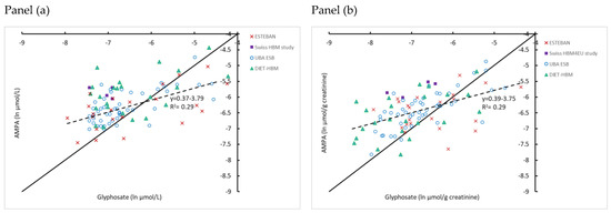 HBM4EU harmonized data (Germany (UBA ESB), Switzerland (Swiss HBM4EU study), France (ESTEBAN), Iceland (DIET-HBM)) for glyphosate and AMPA in adults. Data (>LOQ) are expressed on a natural logarithmic scale. The 1:1 line (full line) is indicated. Panel (a): µg/L scale and panel (b): µg/g creatinine scale. Values below LOQ are not included.