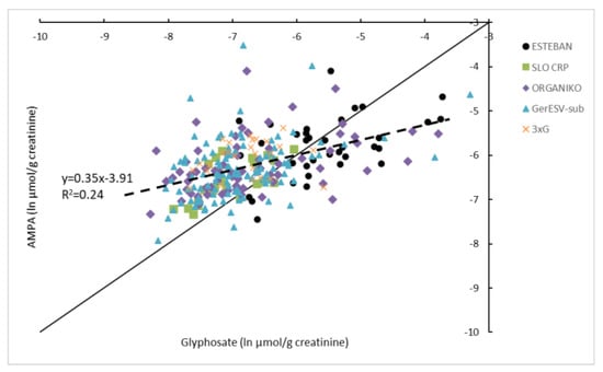 HBM4EU harmonized data (Belgium (3XG), Cyprus (ORGANIKO), Germany (GerES V-sub), Slovenia (SLO_CRP), France (ESTEBAN)) for glyphosate and AMPA in children. Data (>LOQ) are expressed on a natural logarithmic scale and corrected for creatinine. The 1:1 line (full line) is indicated. See also [8] for more information on the children’s studies.